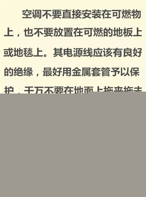 空調安裝的高度、方向、位置,必須有利于空氣循環和散熱,并注意與窗簾等可燃物保持一定的距離。空調運行時,應避免與其它物品靠得太近,更不可將物品覆蓋在空調上。